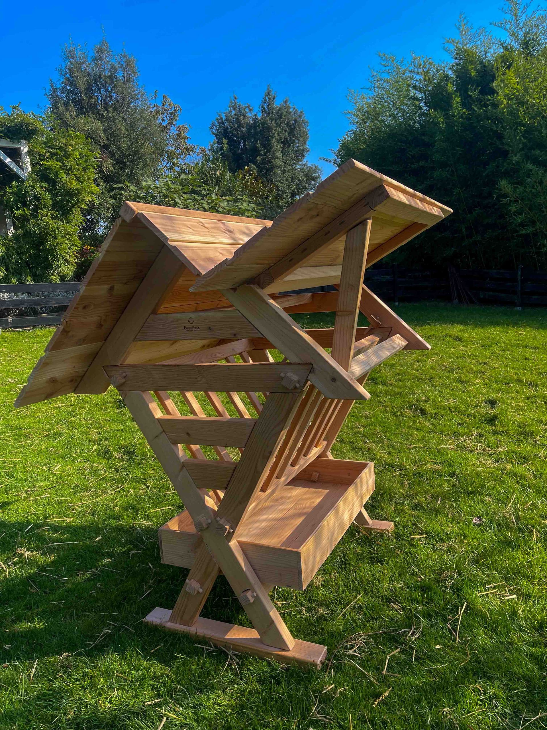 Het dak is afneembaar en ook de deksel is te verwijderen. Het dak is met borgpennen bevestigd aan de ruif.